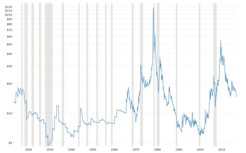 Es ist wichtig, hier anzumerken, dass dies nur eine grobe Zusammenfassung ist und dass es im Laufe der Jahre viele Schwankungen und Korrekturen bei den Silber-Börsenkursen gegeben hat.